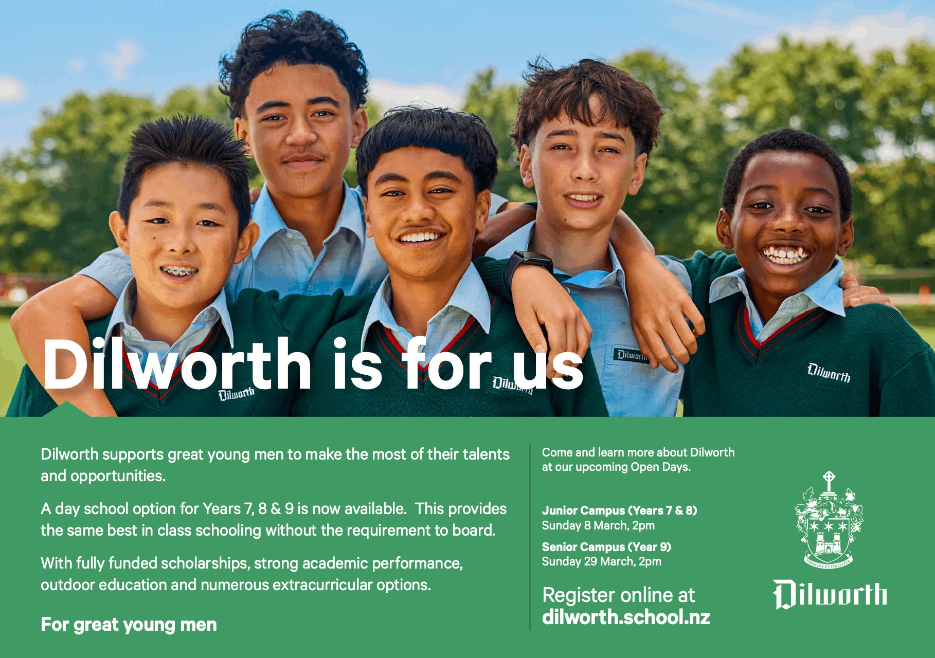 Now is the time to consider whether Dilworth might be for your son.  While predominately a boarding school, day students are accepted for 2027 in Years 7, 8 & 9. This gives more students the amazing opportunity without the need to board. Check out the links below to find out more and consider registering for one of the upcoming Open Days.  These positions are highly sort after!
